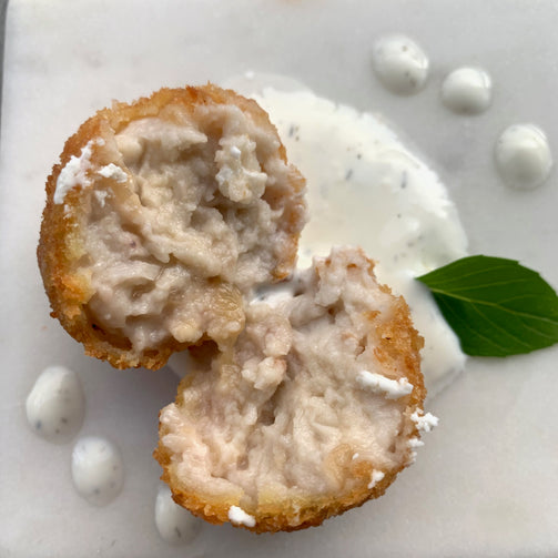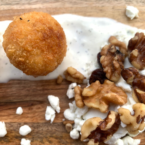 El dulzor de la cebolla, lo salado del queso de cabra y lo crujiente de las nueces, hacen de esta croqueta una de mis preferidas.