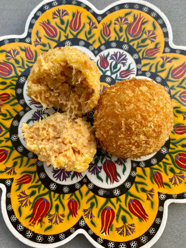 Un rico salmorejo de jueyes criollo con bechamel en una rica croqueta.